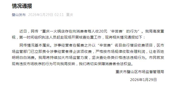 近日,网传“重庆一火锅店存在向消费者每人收20元‘辛苦费’的行为”。我局高度重视,第一时间组织执法人员赶赴现场开展核查处置工作股票配资代理网,现将相关情况通报如下: