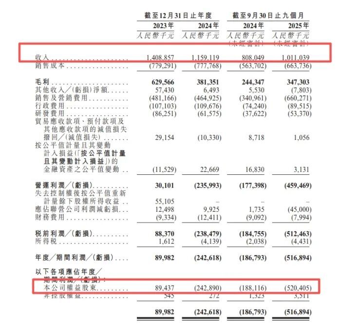 根据招股书,近年来公司业绩承压。2023年、2024年及2025年前9个月,中文在线的收入分别为14.09亿元、11.59亿元及10.11亿元。同期,公司权益股东期内利润分别为8943.7万元、-2.43亿元、-5.2亿元。