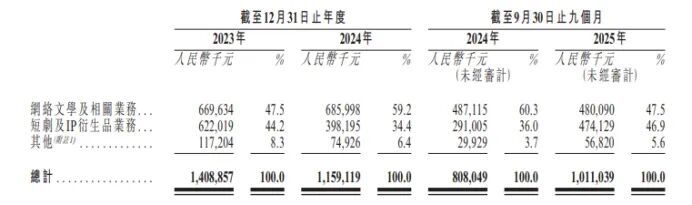 根据招股书,2025年前三季度,中文在线网络文学及相关业务收入约为4.8亿元,同比微降,占总收入比重约为47.5%。