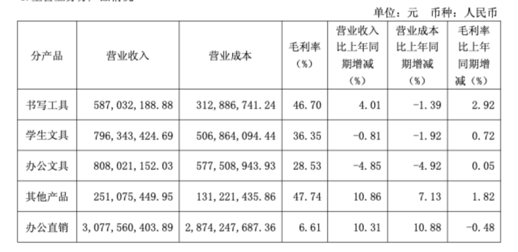 分产品来看,晨光股份的书写工具、办公直销与其他产品营收实现正增长,学生文具、办公文具承压。其中,办公文具营收约8.08亿元,同比下降4.85%,毛利率基本持平,是所有业务中毛利率最低的板块。学生文具营收约7.96亿元,同比微降0.81%,毛利率微升0.72个百分点至36.35%。