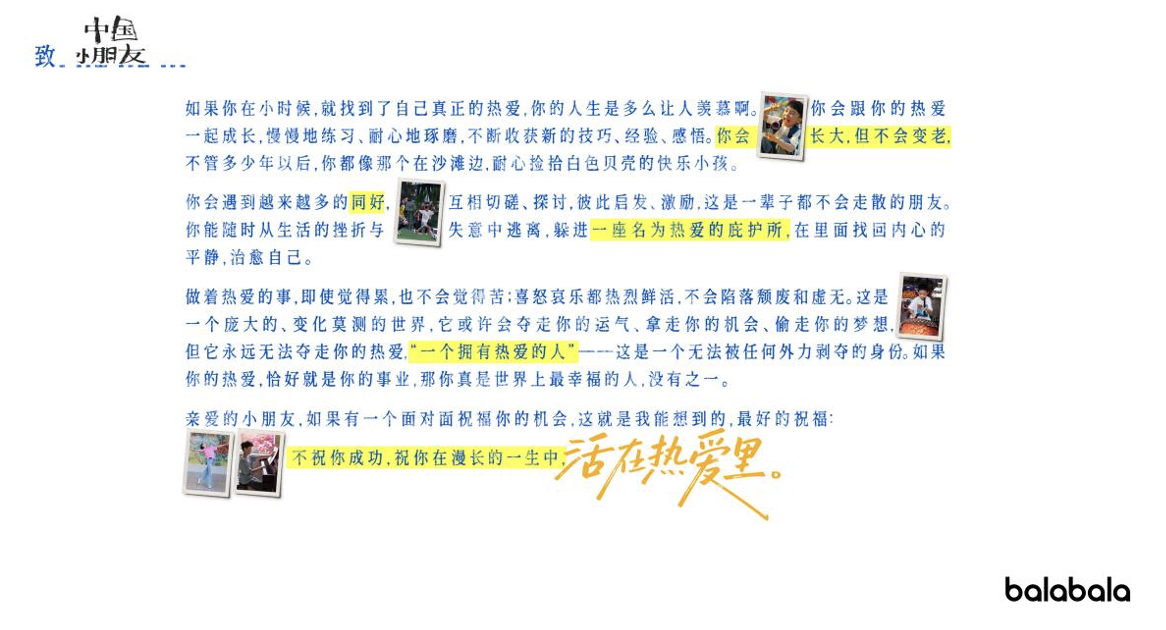 从2002到2026,巴拉巴拉用24年时间陪伴了中国孩子的成长,也见证了中国家庭从“成功论”到“拥抱热爱”的观念变迁。“活在热爱里”不是一句口号,而是一场面向全社会、关于“什么是最好的童年”的价值观倡导。它告诉每一个焦虑的父母:成功不是唯一的答案,热爱才是孩子眼里的光、心里的根、抵御风浪的庇护所。